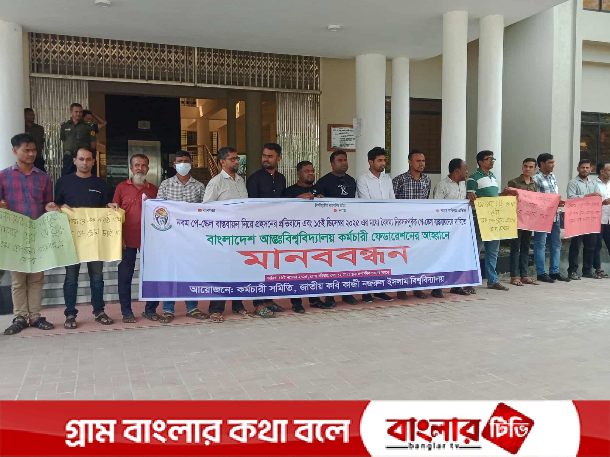নবম পে-স্কেল বাস্তবায়ন ও বেতন কাঠামো পুনর্গঠনের দাবিতে জাতীয় কবি কাজী নজরুল ইসলাম বিশ্ববিদ্যালয়ে ঘণ্টাব্যাপী মানববন্ধন অনুষ্ঠিত হয়েছে।