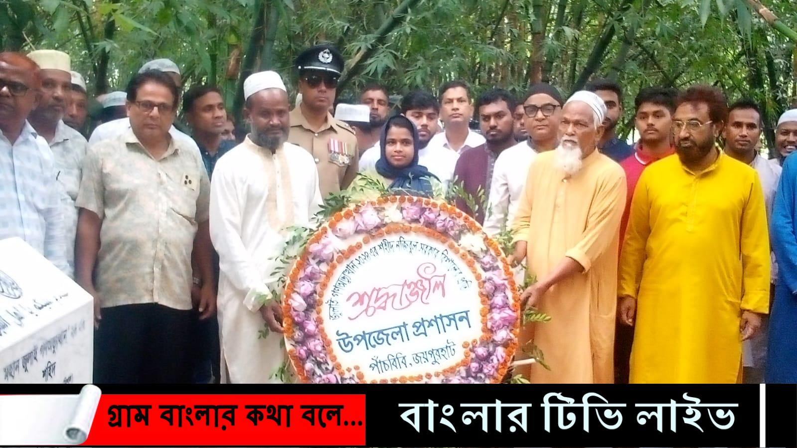 মঙ্গলবার (৫ আগস্ট) সকালে পাঁচবিবি উপজেলা নির্বাহী কর্মকর্তা রোমনা রিয়াজ উপজেলার ধরঞ্জী ইউনিয়নের রতনপুর গ্রামের শহীদ নজিবুল সরকার বিশালের কবরে পুষ্পস্তবক ও কবর জিয়ারত করেন ।