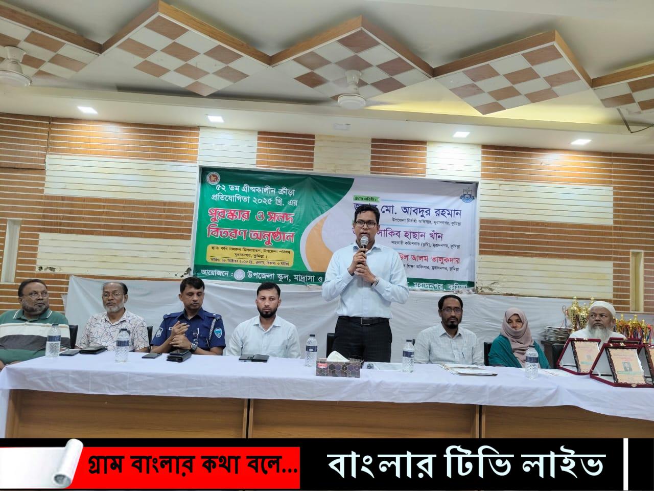 কুমিল্লার মুরাদনগরে ৫২ তম জাতীয় স্কুল, মাদ্রাসা ও কারিগরি শিক্ষা ক্রীড়া সমিতির গ্রীষ্মকালীন ক্রীড়া প্রতিযোগিতার পুরস্কার ও সনদ বিতরণ অনুষ্ঠিত হয়েছে।
