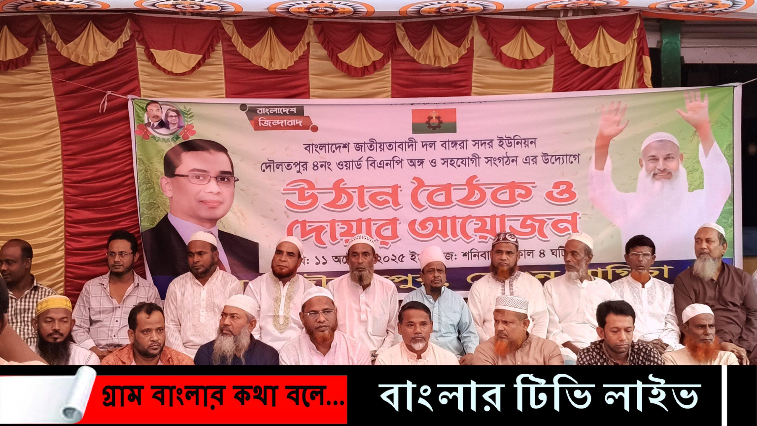 ১১ই অক্টোবর শনিবার বিকেলে উপজেলার বাঙ্গরা বাজার থানাধীন দৌলতপুরে এই উঠান বৈঠক করেছে ৪নং ওয়ার্ড বিএনপি অঙ্গ ও সহযোগী সংগঠনের নেতা-কর্মীরা। এসময় বিএনপির ভাইস চেয়ারম্যান ও সাবেক এমপি কাজী শাহ মোফাজ্জল হোসাইন কায়কোবাদ এবং মুরাদনগর উপজেলা বিএনপির সদস্য সচিব মোল্লা মুজিবুল হকের সুস্থতা কামনায় দোয়া ও মোনাজাত করা হয়।