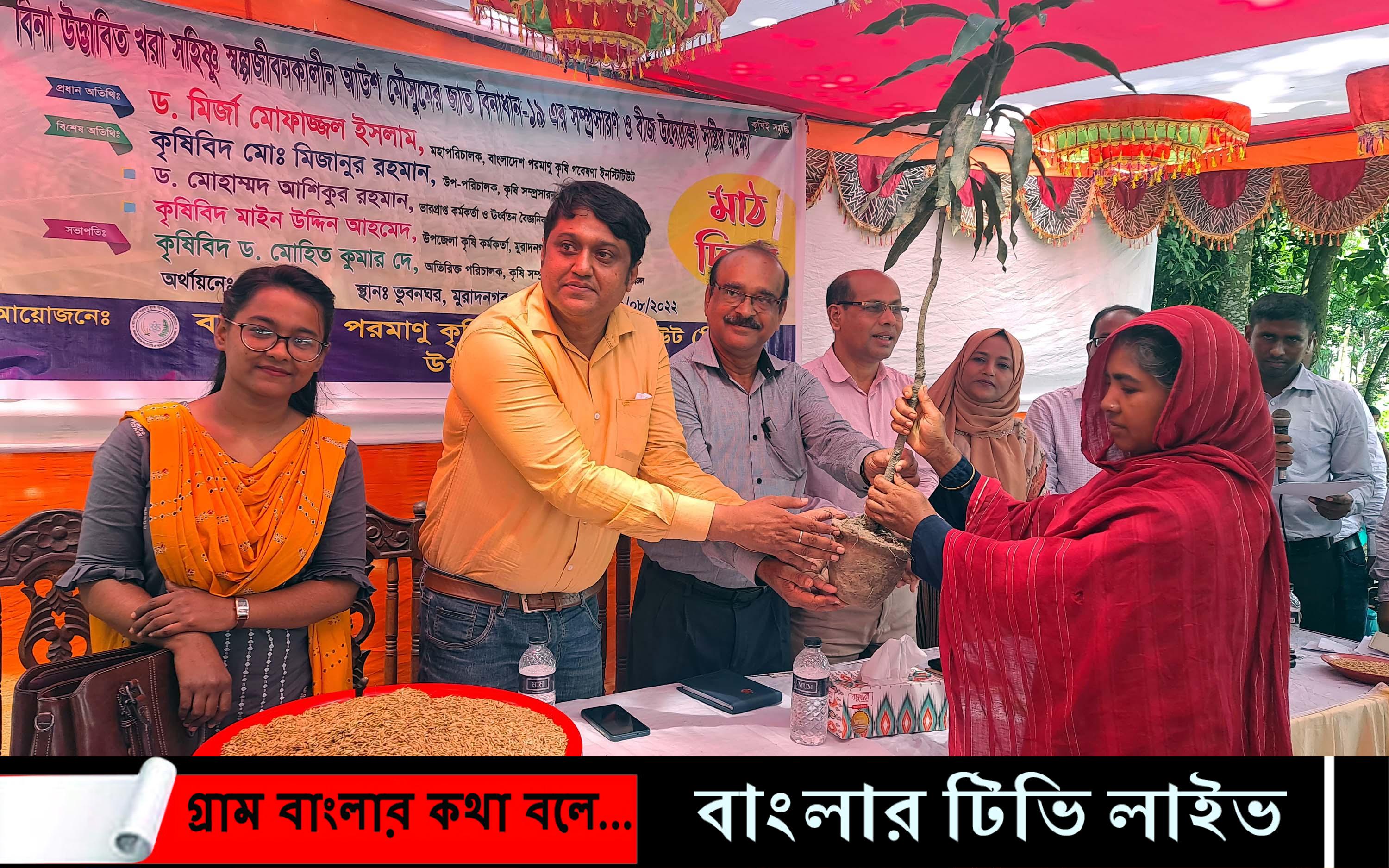 কুমিল্লার মুরাদনগর উপজেলায় বিনা উদ্ভাবিত খরা সহিষ্ণু স্বল্পীবনকালীন আউশ মৌসুমের জাত বিনাধান-১৯ এর সম্প্রসারণ ও বীজ উদ্যোক্তা সৃষ্টির লক্ষ্যে মাঠ দিবস অনুষ্ঠিত হয়েছে। পরে উপস্থিত সকল কৃষকদের মাঝে আমের চারা গাছ বিতরন করা হয়।