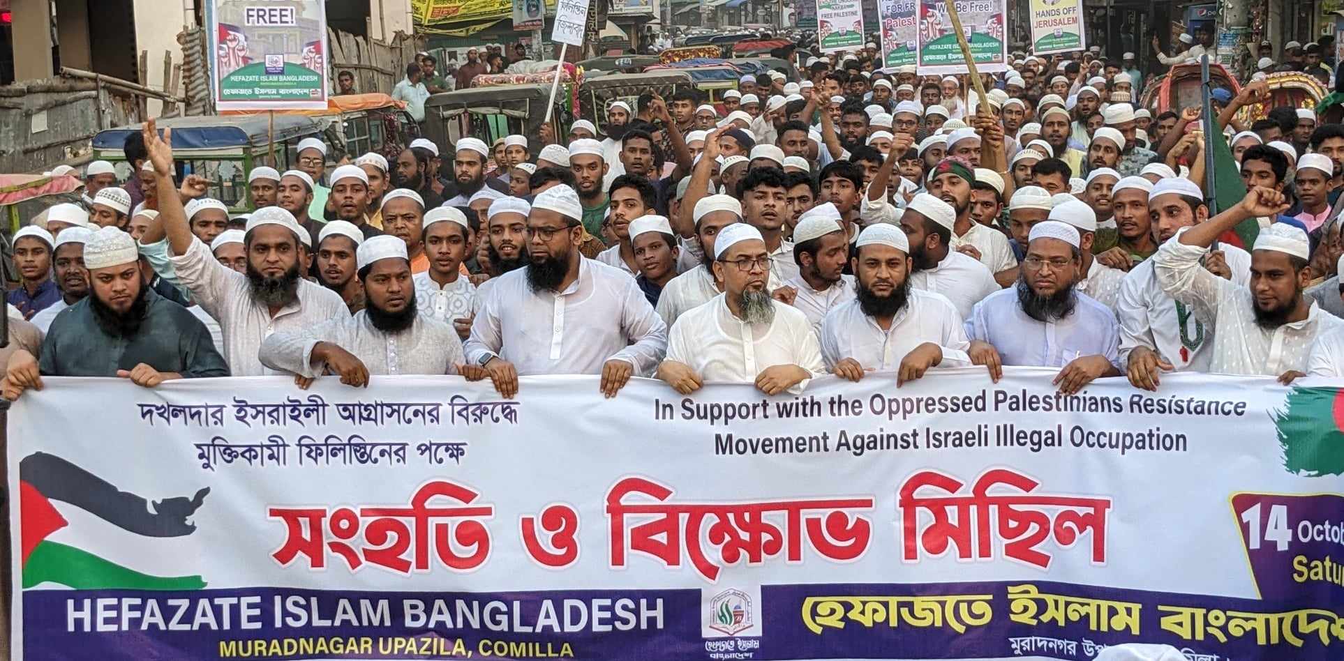 মুরাদনগর (কুমিল্লা) প্রতিনিধিঃ “দখলদার ইসরাইলী আগ্রাসনের বিরুদ্ধে মুক্তিকামী ফিলিস্তিনের পক্ষে সংহতি ও বিক্ষোভ মিছিল এবং প্রতিবাদ সমাবেশ করেছে কুমিল্লার মুরাদনগর উপজেলা শাখার হেফাজতে ইসলাম বাংলাদেশ। শনিবার আসর নামাজ শেষে উপজেলার