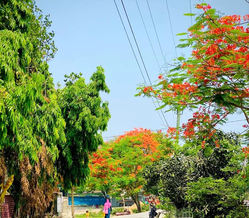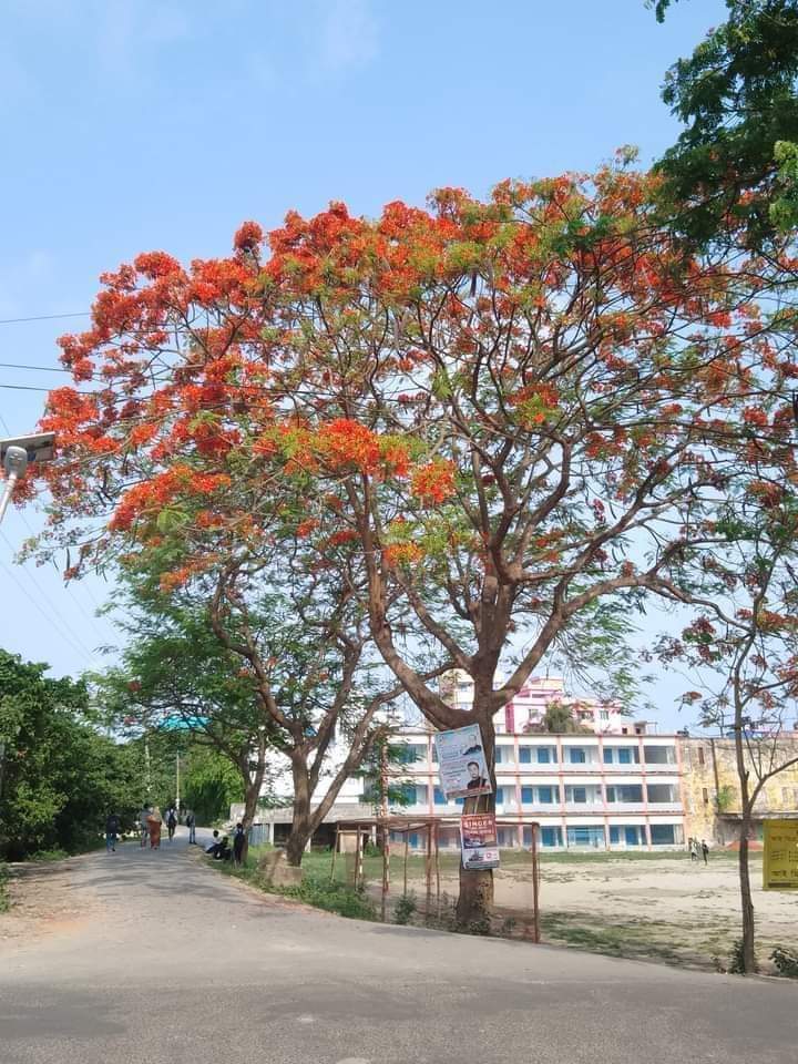 “গন্ধে উদাস হাওয়ার মতো উড়ে তোমার উত্তরী কর্ণে তোমার কৃষ্ণচূড়ার মঞ্জরি” কবিগুরু রবীন্দ্রনাথ ঠাকুরের মতো অনেকেই বাংলা কবিতা-গানে উপমা হিসেবে নানা ভঙ্গিমায় কৃষ্ণচূড়াকে ব্যবহার করেছেন। গ্রীষ্মের এই সময়টায় বিভিন্ন পথে-প্রান্তরে, শিক্ষা প্রতিষ্ঠান ও স্থানীয়দের বসত বাড়ির আঙ্গিণায় শোভা পাচ্ছে রক্তলাল ফুল সমৃদ্ধ অসংখ্য কৃষ্ণচূড়া গাছ। দূর থেকে দেখলে মনে হয়, বৈশাখের রৌদ্দুরের সবটুকু উত্তাপ গায়ে মেখে নিয়েছে রক্তিম পুষ্পরাজি, সবুজ চিরল পাতার মাঝে যেন আগুন জ্বলছে। গ্রীষ্মের ঘামঝরা দুপুরে কৃষ্ণচূড়ার ছায়া যেন প্রশান্তি এনে দেয় অবসন্ন পথিকের মনে।