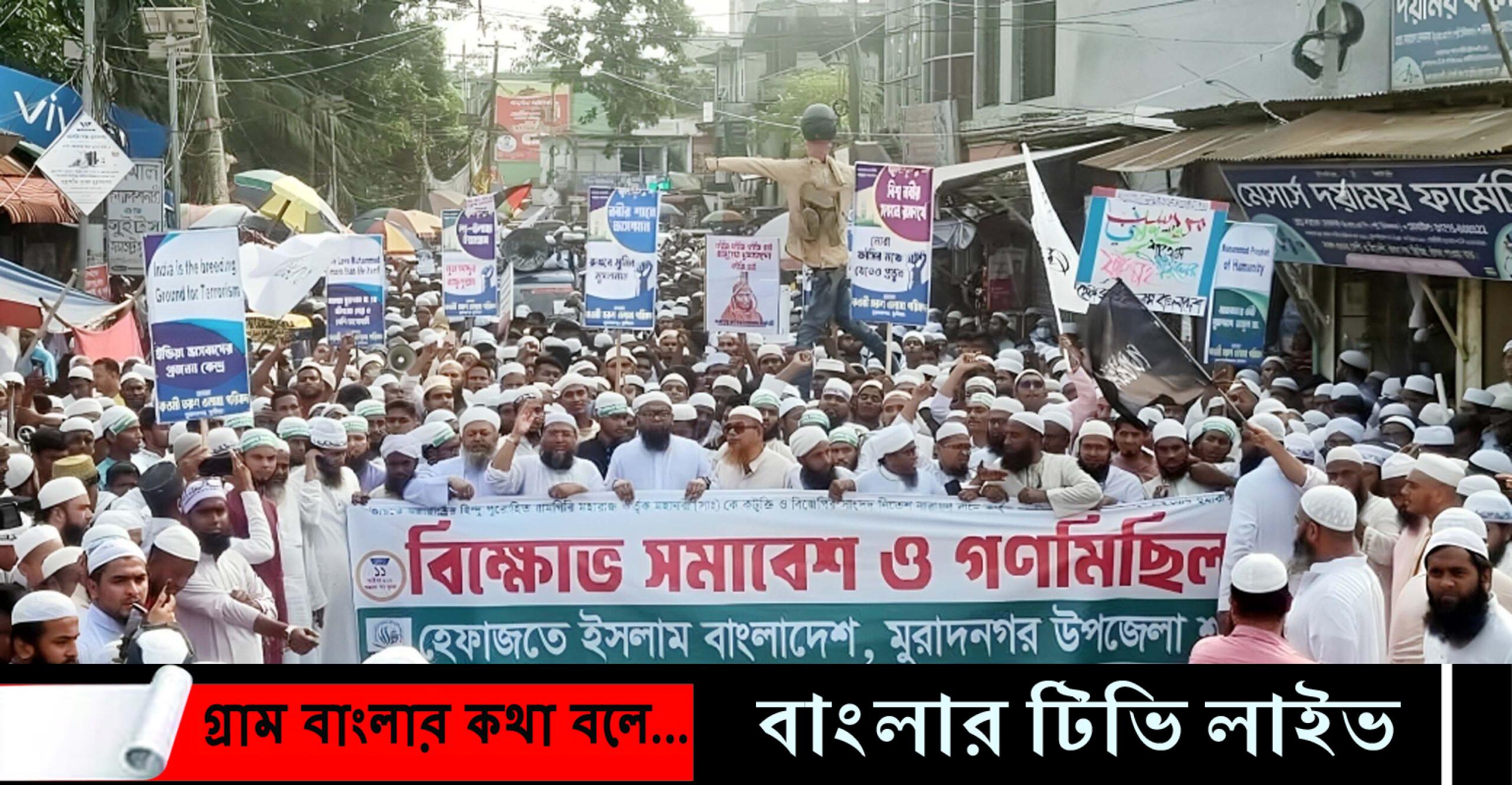 ভারতের মহারাষ্ট্রের হিন্দু পুরোহিত রামগিরি মহারাজ কর্তৃক মহানবী (সাঃ) কে কট‚ক্তি ও বিজিপির সাংসদ নিতেশ নারায়ণ রানে কর্তৃক মসজিদে ঢুকে মুসলমানদের হত্যার হুমকি দেওয়ার প্রতিবাদে কুমিল্লার মুরাদনগর উপজেলায় বিক্ষোভ মিছিল ও সমাবেশ করে হেফাজতে ইসলাম বাংলাদেশ ও সর্বস্তরের তৌহিদী জনতা। এতে উপজেলার বিভিন্ন মসজিদের মাদ্রাসার হাজার হাজার মুসল্লি ও শিক্ষক-শিক্ষার্থীরা অংশ গ্রহন করেন।