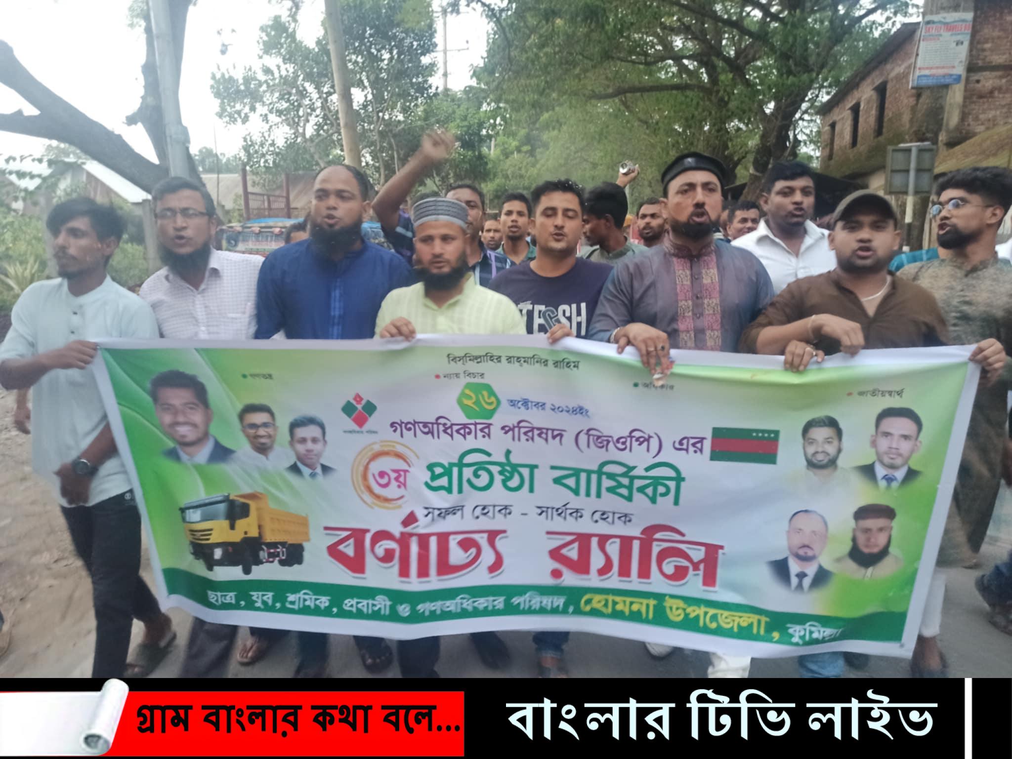 গণতন্ত্র ও নাগরিক অধিকারের অগ্রযাত্রায় নতুন প্রতিশ্রুতিতে কুমিল্লার হোমনায় ২৬ অক্টোবর শনিবার গণ অধিকার পরিষদের ৩য় প্রতিষ্ঠা বার্ষিকী উৎযাপন ও বর্ণাঢ্য র্যালী অনুষ্ঠিত হয়।