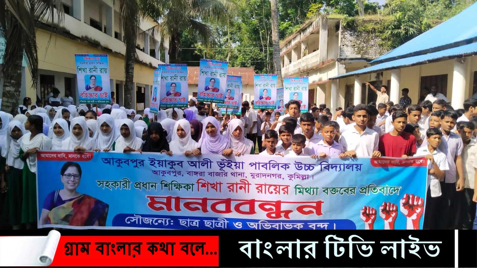 বিদ্যালয়ের ছয় শিক্ষার্থীর বিরুদ্ধে দায়ের করা মামলা প্রত্যাহার এবং মামলার বাদী সহকারী প্রধান শিক্ষকের পদত্যাগ দাবীতে মানববন্ধন ও বিক্ষোভ সমাবেশ করেছে ছাত্র-ছাত্রী, প্রাক্তন শিক্ষার্থী ও অভিভাবকরা। মঙ্গলবার সকাল ১০টায় কুমিল্লা জেলার মুরাদনগর উপজেলার আকুবপুর ইয়াকুব আলী ভূইয়া পাবলিক উচ্চ বিদ্যালয়ে এই মানববন্ধন ও বিক্ষোভ সমাবেশ করা হয়।