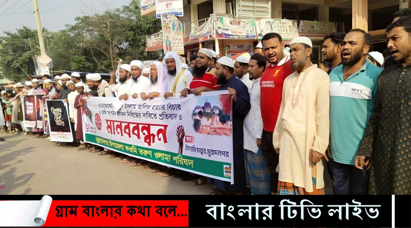 জাতীয় পতাকা অবমাননা, মসজিদ ভাঙচুর, চট্রগ্রামের আইনজীবী সাইফুল ইসলাম আলিফের হত্যার বিচার ও হিন্দু সংগঠন ইসকনের সব কার্যক্রম নিষিদ্ধ করার দাবিতে মানববন্ধন ও বিক্ষোভ মিছিল করে কুমিল্লার মুরাদনগর উপজেলা কওমি তরুন ওলামা পরিষদ।