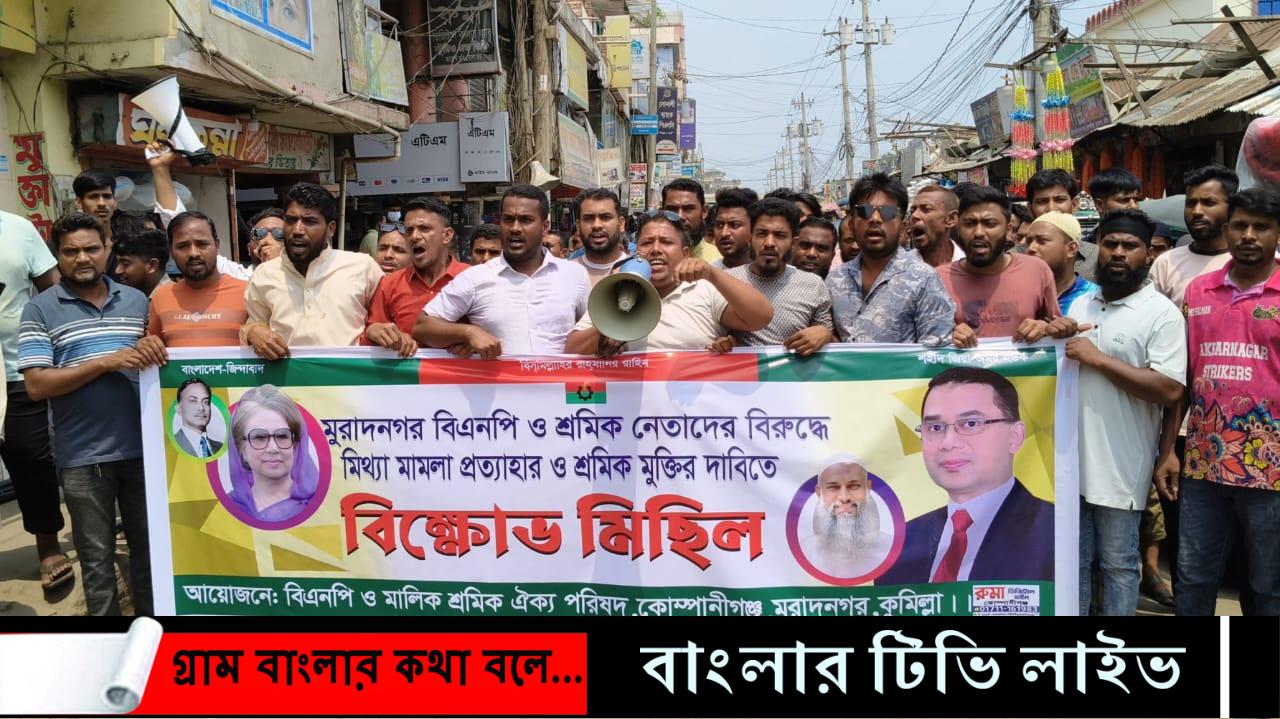 পুলিশের হাতে গ্রেফতার বিএনপি ও পরিবহন শ্রমিক নেতাকর্মীদের বিরুদ্ধে দায়ের করা মিথ্যা মামলা প্রত্যাহার ও আটককৃত বিএনপি নেতার রিমান্ড বাতিল এবং পরিবহন শ্রমিকদের নিঃশর্ত মুক্তির দাবীতে বিক্ষোভ মিছিল করেছে মুরাদনগর উপজেলা পরিবহন মালিক শ্রমিক ঐক্য পরিষদ।