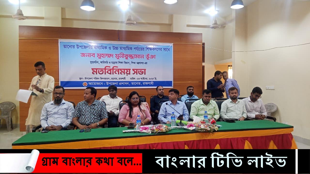 রাজশাহীর তানোরে মাধ্যমিক ও উচ্চ মাধ্যমিক পর্যায়ের শিক্ষার মানোন্নয়নে শিক্ষকদের সাথে মতবিনিময় সভা অনুষ্ঠিত হয়েছে। বৃহস্পতিবার (২৩ অক্টোবর) দুপুরে উপজেলা পরিষদ মিলনায়তনে এ সভা অনুষ্ঠিত হয়।