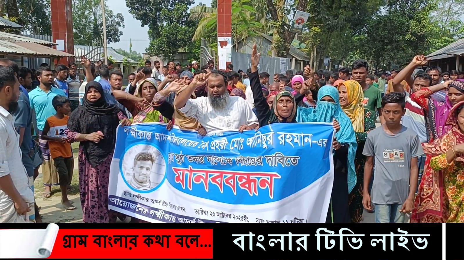 কুড়িগ্রামের লক্ষ্মীকান্ত আর্দশ উচ্চ বিদ্যালয়ের নৈশ প্রহরি আনিছুর রহমান (৩৫) এর রহস্যজনক মৃত্যুর সুষ্ঠু তদন্ত ও বিচারের দাবিতে মানববন্ধন ও বিক্ষোভ মিছিল অনুষ্ঠিত হয়েছে।