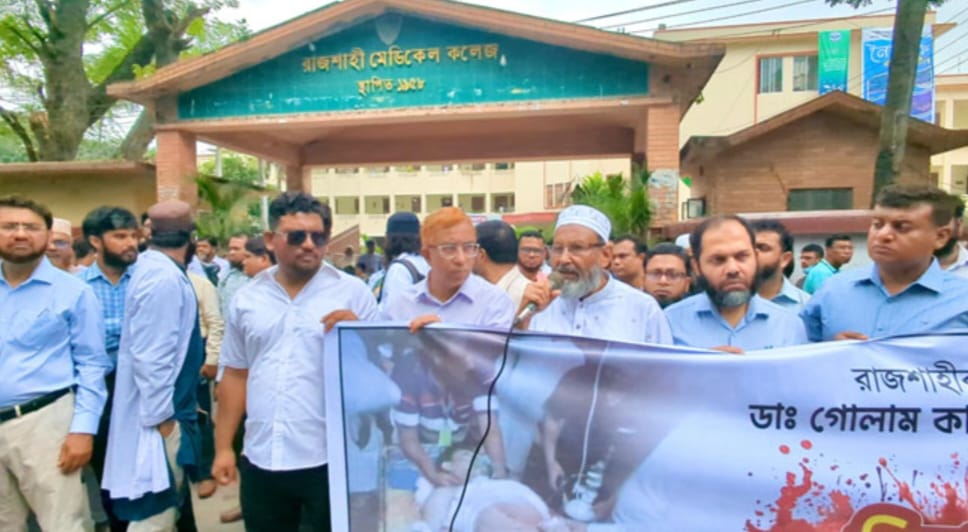 রাজশাহীর প্রখ্যাত চিকিৎসক ডা. গোলাম কাজেম আলী হত্যার দুই বছর পেরিয়ে গেলেও বিচার না হওয়ায় ক্ষোভ প্রকাশ করেছেন রাজশাহী মেডিকেল কলেজ (রামেক) হাসপাতালের চিকিৎসক, শিক্ষক ও শিক্ষার্থীরা। বৃহস্পতিবার (৩০ অক্টোবর) সকালে বৈষম্য বিরোধী চিকিৎসক ফোরামের উদ্যোগে এক সংবাদ সম্মেলন ও মানববন্ধনের মাধ্যমে তারা হত্যার সুষ্ঠু বিচার দাবিতে কর্মসূচি পালন করেন।