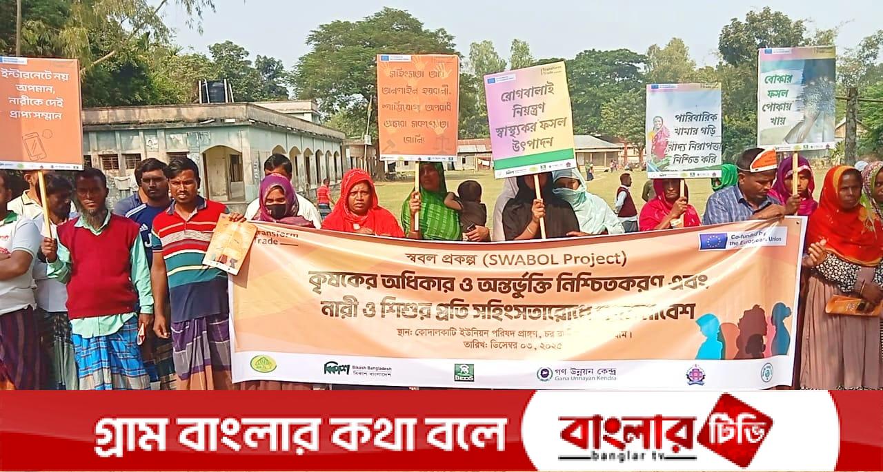 ২৫ নভেম্বর থেকে ১০ ডিসেম্বর পর্যন্তু আন্তর্জাতিক নারী নির্যাতন প্রতিরোধ পক্ষ ২০২৫ উদযাপন উপলক্ষে “নারী ও কিশোরীর প্রতি ডিজিটাল সহিংসতা প্রতিরোধ করি” এই প্রতিপাদ্যকে সামনে রেখে ১৬ দিনব্যাপী ক্যাম্পেইনের অংশ হিসেবে চর রাজীবপুর উপজেলার কোদালকাটি ইউনিয়ন পরিষদ চত্ত্বরে নারীদের সচেতনতা বৃদ্ধি, আলোচনা সভা, র্যালি, গণসমাবেশ ও পালাগানের আয়োজন করা হয়েছে। বুধবার (৩ ডিসেম্বর) swabol প্রকল্পের উপজেলা কৃষি পণ্য উৎপাদক অ্যাসোসিয়েশন এবং এলএফ ও সদস্যদের উদ্যোগে এ কর্মসূচি অনুষ্ঠিত হয়।