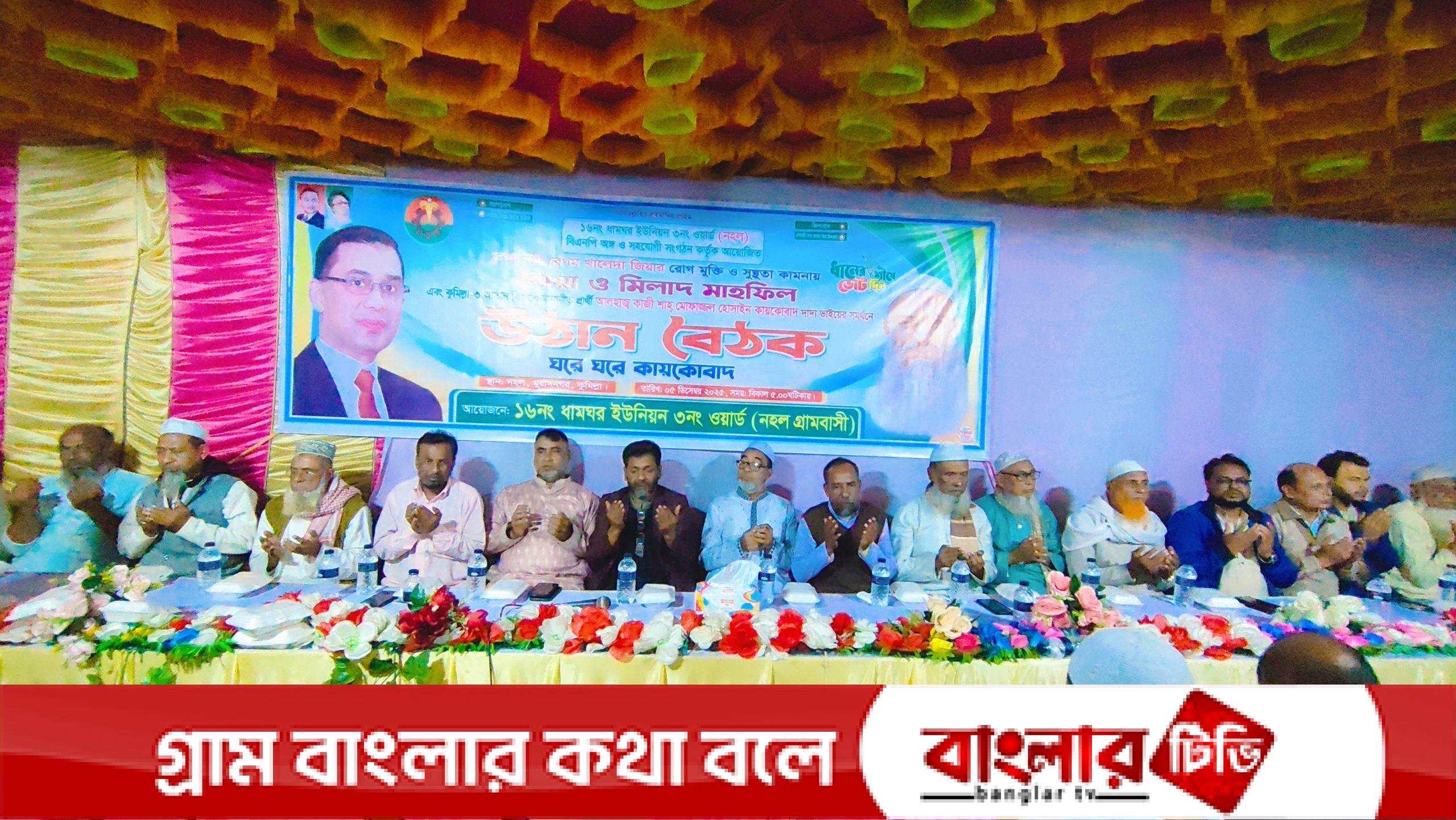 বাংলাদেশ জাতীয়তাবাদী দল বিএনপির চেয়ারপার্সন ও সাবেক প্রধানমন্ত্রী বেগম খালেদা জিয়ার রোগ মুক্তি ও সুস্থতা কামনায় দোয়া মাহফিল করেছে মুরাদনগর উপজেলার ধামঘর ইউনিয়নের ৩নং ওয়ার্ড (নফল গ্ৰামবাসী) বিএনপি। এসময় বিএনপির কেন্দ্রীয় কমিটির ভাইস চেয়ারম্যান ও সাবেক সংসদ সদস্য কাজী শাহ হোসাইন কায়কোবাদের সুস্থতার জন্যও দোয়া করা হয়।
