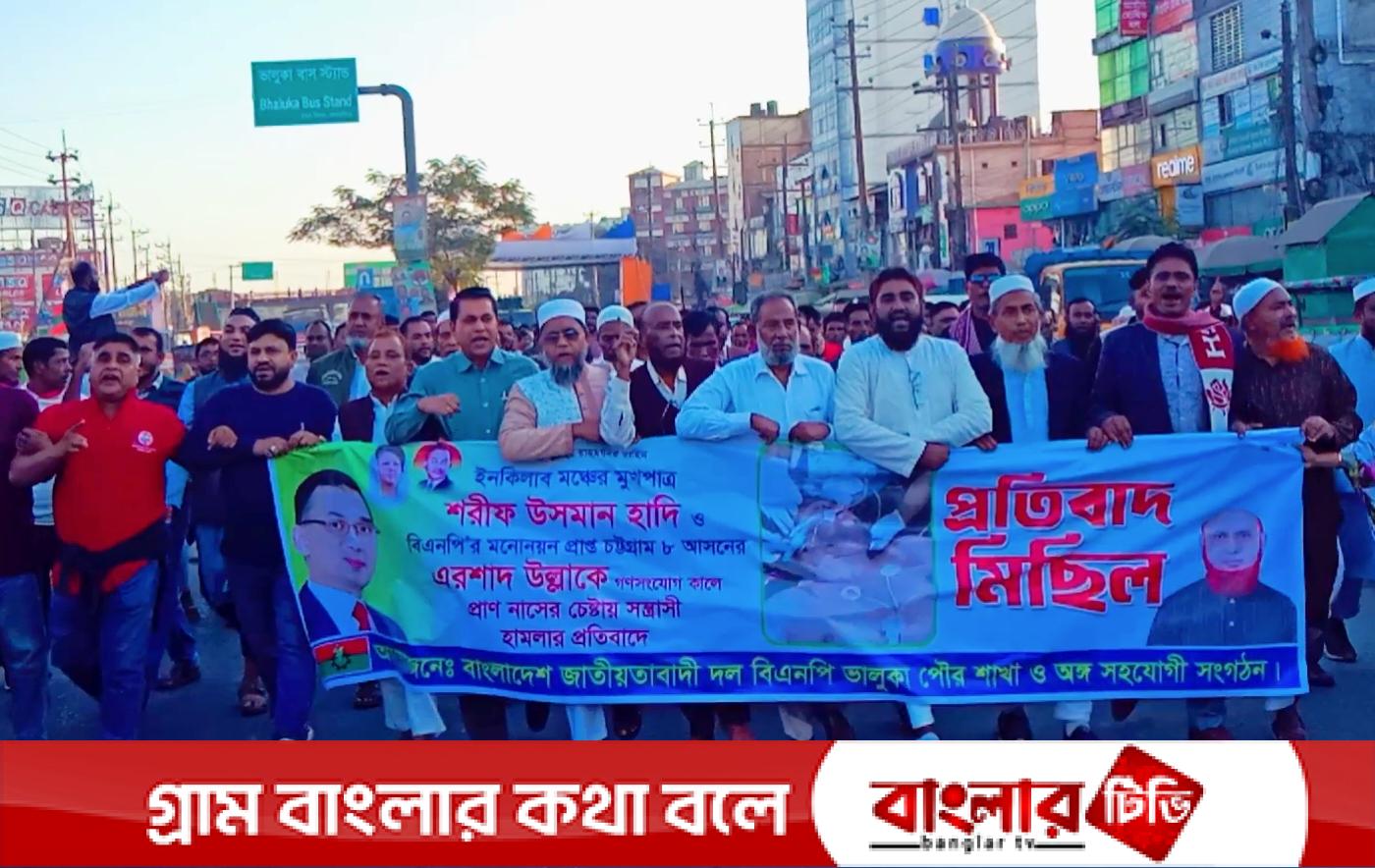 ময়মনসিংহের ভালুকায় ইনকিলাব মঞ্চের মুখপাত্র ও ঢাকা-৮ আসনের স্বতন্ত্র প্রার্থী শরিফ ওসমান হাদি এবং বিএনপির মনোনীত চট্টগ্রাম-৮ আসনের প্রার্থী এরশাদ উল্লাহর ওপর গণসংযোগকালে গুলি করে প্রাণনাশের চেষ্টায় সন্ত্রাসী হামলার প্রতিবাদে শনিবার (১৩ ডিসেম্বর) বিকেলে ময়মনসিংহ দক্ষিণ জেলা বিএনপির সদস্য ও ভালুকা পৌর বিএনপির আহবায়ক আলহাজ্ব হাতেম খানের নির্দেশে প্রতিবাদ মিছিল করেছে ভালুকা পৌর বিএনপি।