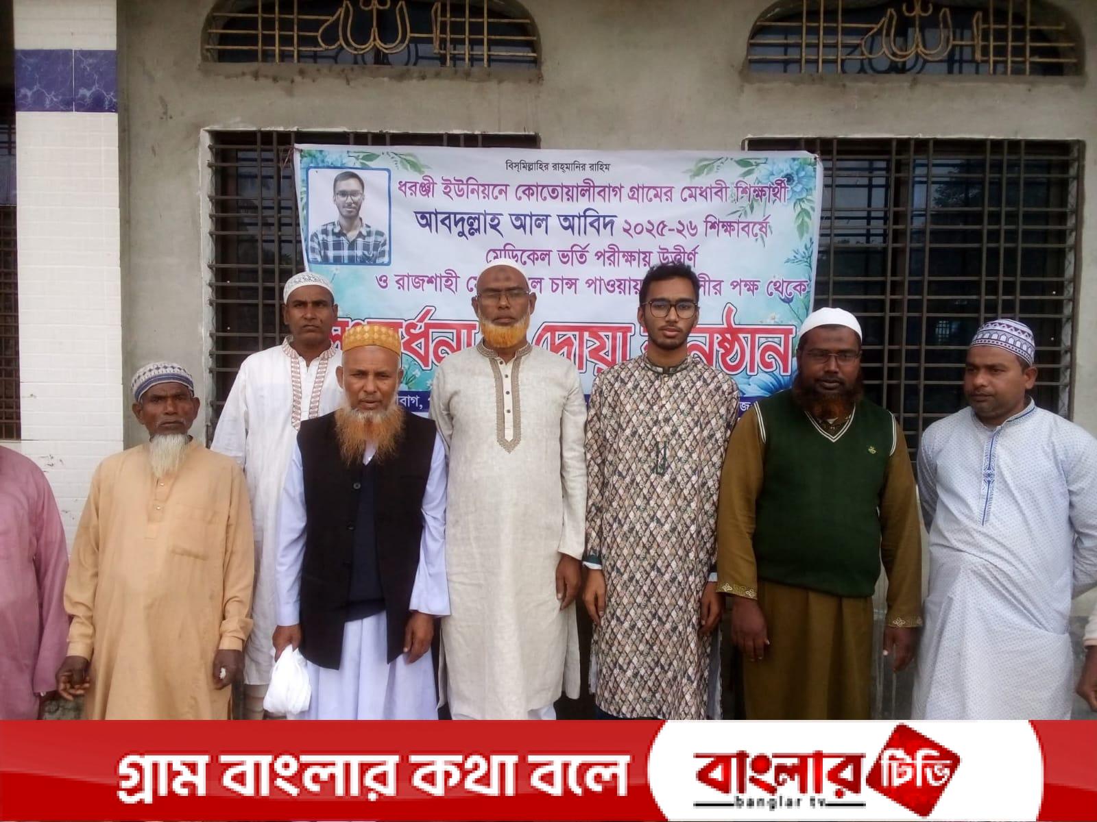 এই আনন্দকে স্বরণীয় করে রাখতে শুক্রবার (১৯ ডিসেম্বর ২০২৫) জুমার নামাজ শেষে কোতোয়ালীবাগ গ্রামবাসীর আয়োজনে আব্দুল্লাহ আল আবিদের জন্য দোয়া মাহফিল ও বিশেষ সংবর্ধনার আয়োজন করেন। এ সময় তার উজ্জ্বল ভবিষ্যৎ ও সুস্থতা কামনা করে বিশেষ মোনাজাত করা হয়।