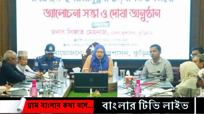 কুড়িগ্রাম প্রতিনিধি।। পবিত্র ঈদে মিলাদুন্নবী (সা.) উপলক্ষে কুড়িগ্রাম জেলা প্রশাসনের উদ্যোগে আলোচনা সভা ও দোয়া মাহফিল অনুষ্ঠিত হয়েছে। অনুষ্ঠানে জেলা প্রশাসনের কর্মকর্তা, জনপ্রতিনিধি, ধর্মীয় নেতৃবৃন্দসহ নানা শ্রেণি-পেশার মানুষ অংশ
